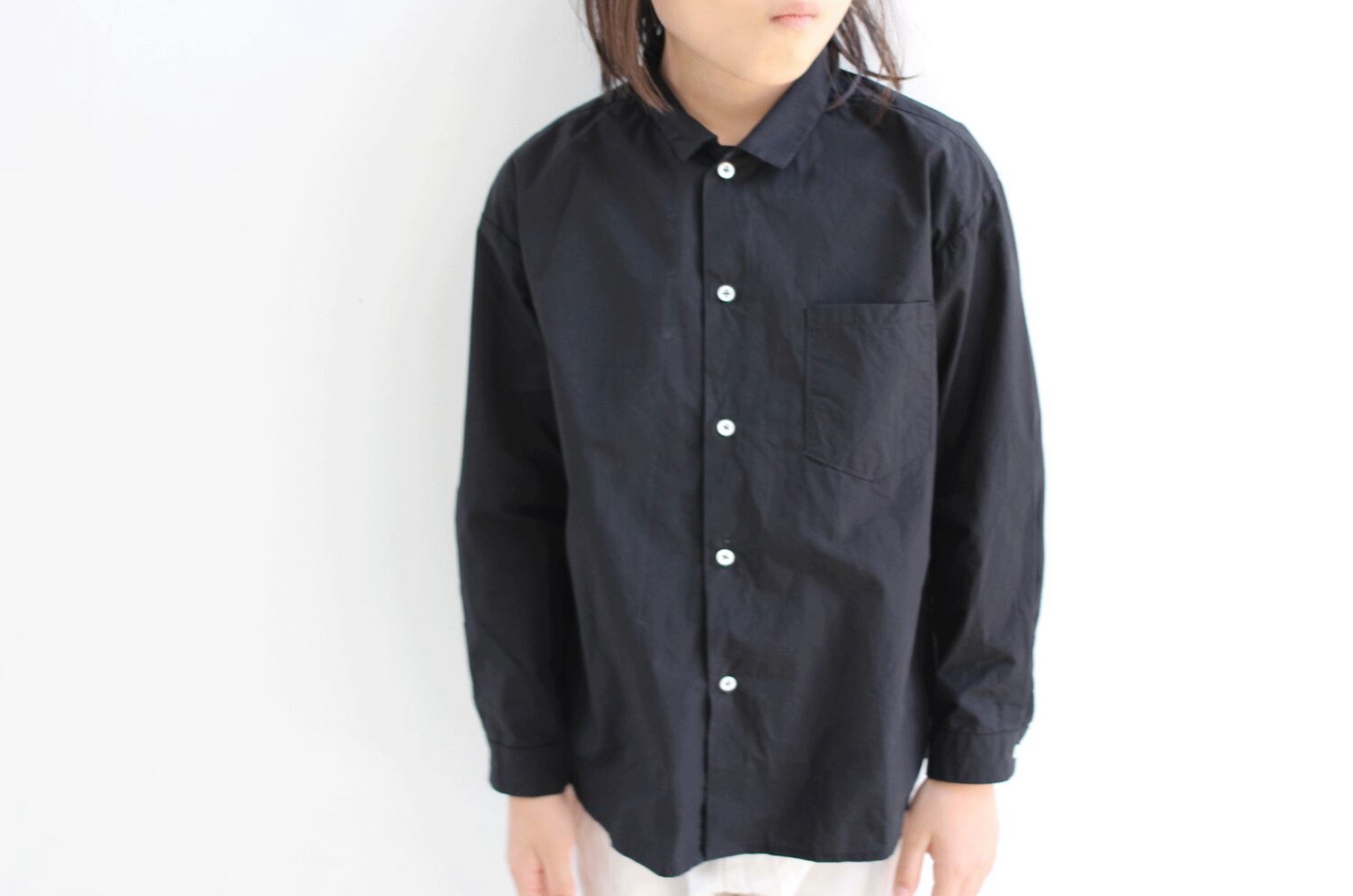 シャツというアイテムはデザインが完成していて、特にシンプルなシャツはデザインを加えることが難しかったりもするのですが、このシャツは小振りな襟と、細く採った袖口のカフが特徴になっていて、子供らしく見える可愛いバランスにデザインが整えられています。
